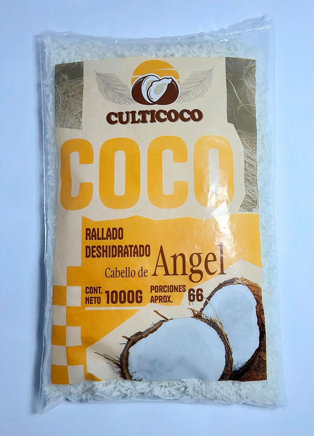 Coco rallado 100% natural, de textura fina tipo cabello de ángel, sin aditivos ni conservantes. Ideal para repostería, smoothies y recetas creativas, aporta un sabor tropical auténtico y una versatilidad perfecta para el uso diario.